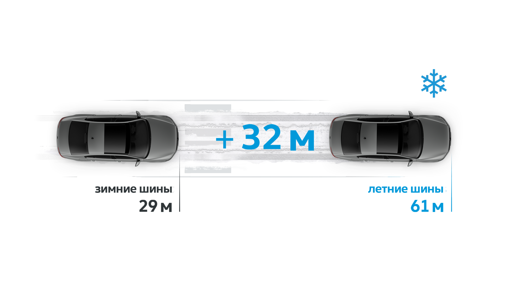 Тормозной путь со скорости 40 км/ч на заснеженной дороге. Условия испытания: температура — ниже 0 °C.